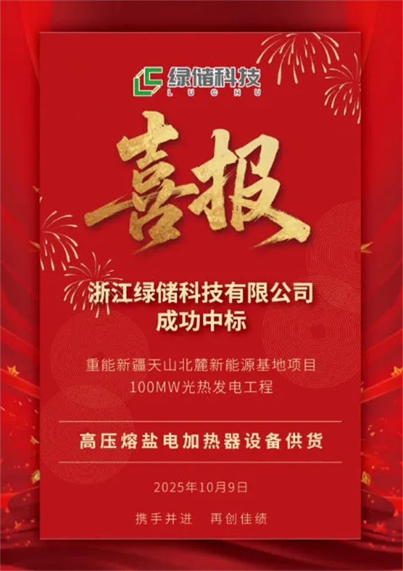 10月9日,浙江绿储科技有限公司(简称:绿储科技)成功中标重能新疆天山北麓新能源基地项目100MW光热发电工程高压熔盐电加热器设备供货订单,为该项目提供熔盐电加热器设备。