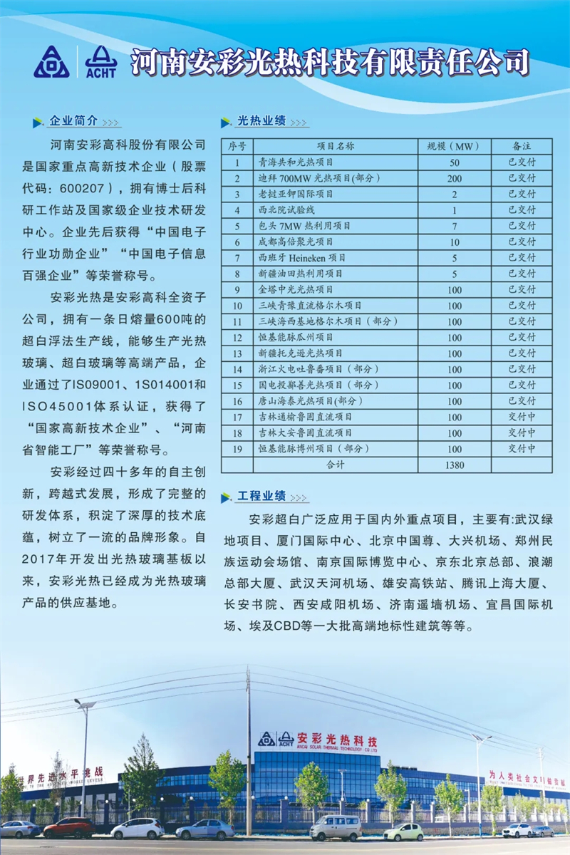 自2017年开发出光热玻璃基板以来,安彩光热科技已经成为光热玻璃产品的供应基地,目前已为迪拜950MW光伏光热电站、青海共和50MW光热电站、西班牙Heineken项目、金塔中光100MW项目、三峡海西基地100MW光热项目、三峡青豫直流二期2、3标段200MW光热项目、吉林大安100MW项目、吉林通榆100MW光热项目等供货,累计供货国内外光热电站项目1380MW。