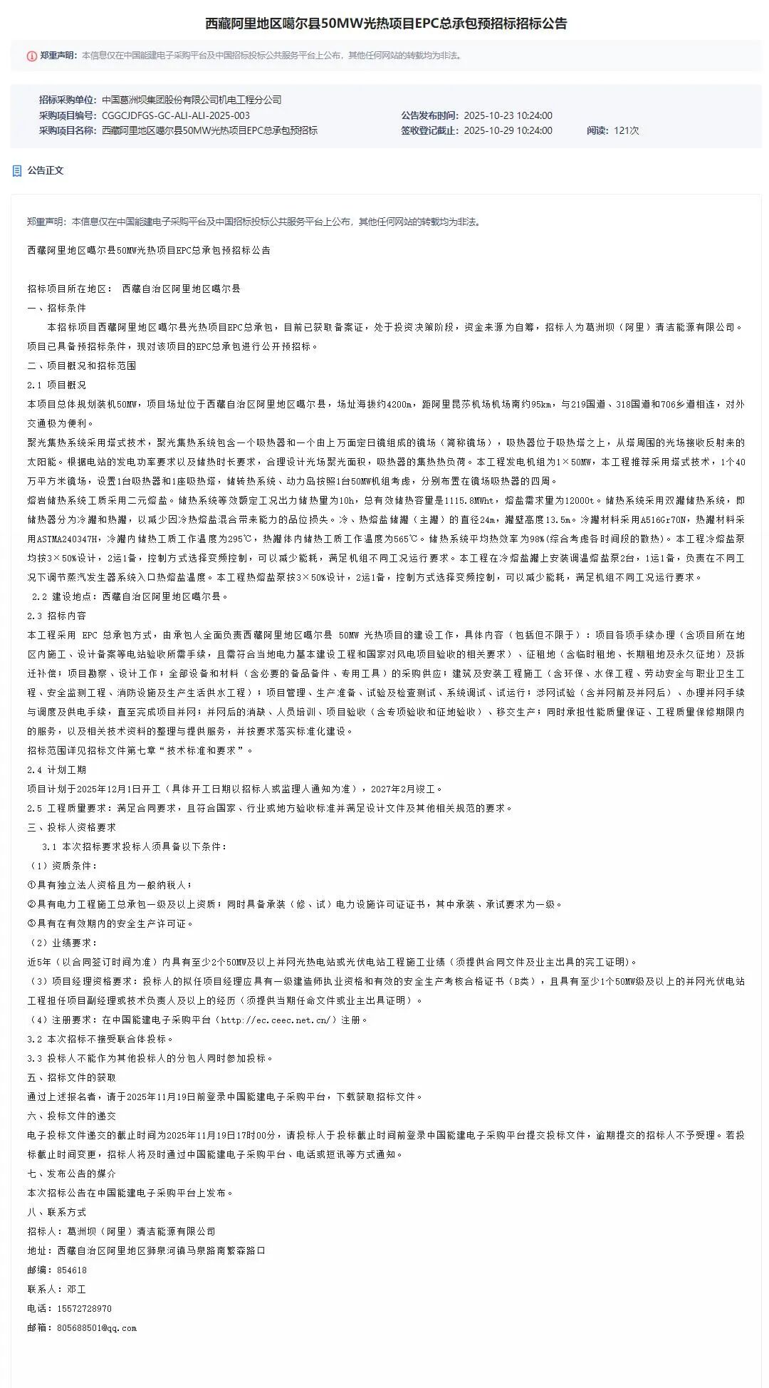 10月23日,葛洲坝(阿里)清洁能源有限公司就西藏阿里地区噶尔县光热项目EPC总承包发布预招标公告。