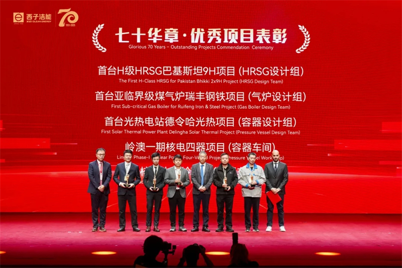 大会对五大优秀项目进行了表彰。优秀项目中“首台H级HRSG巴基斯坦9H项目”,打造了当时全球容量最大联合循环电厂装备,填补亚洲空白,让中国在H级余热锅炉领域跻身国际领先行列;“首台亚临界级煤气炉瑞丰钢铁项目”将发电效率提升至42%,年减排二氧化碳70万吨,成为行业绿色转型的国际标杆;“首台光热电站德令哈项目”,以核心熔盐储能技术实现年减排二氧化碳超12万吨;“岭澳一期核电四器项目”是西子洁能开展核电装备业务的关键一步,该项目是当时岭澳核电国产化最大订单;“核级太平岭项目”是西子洁能获核级制造许可证后的首个订单,为公司进军核级高端装备市场奠定了重要基础。