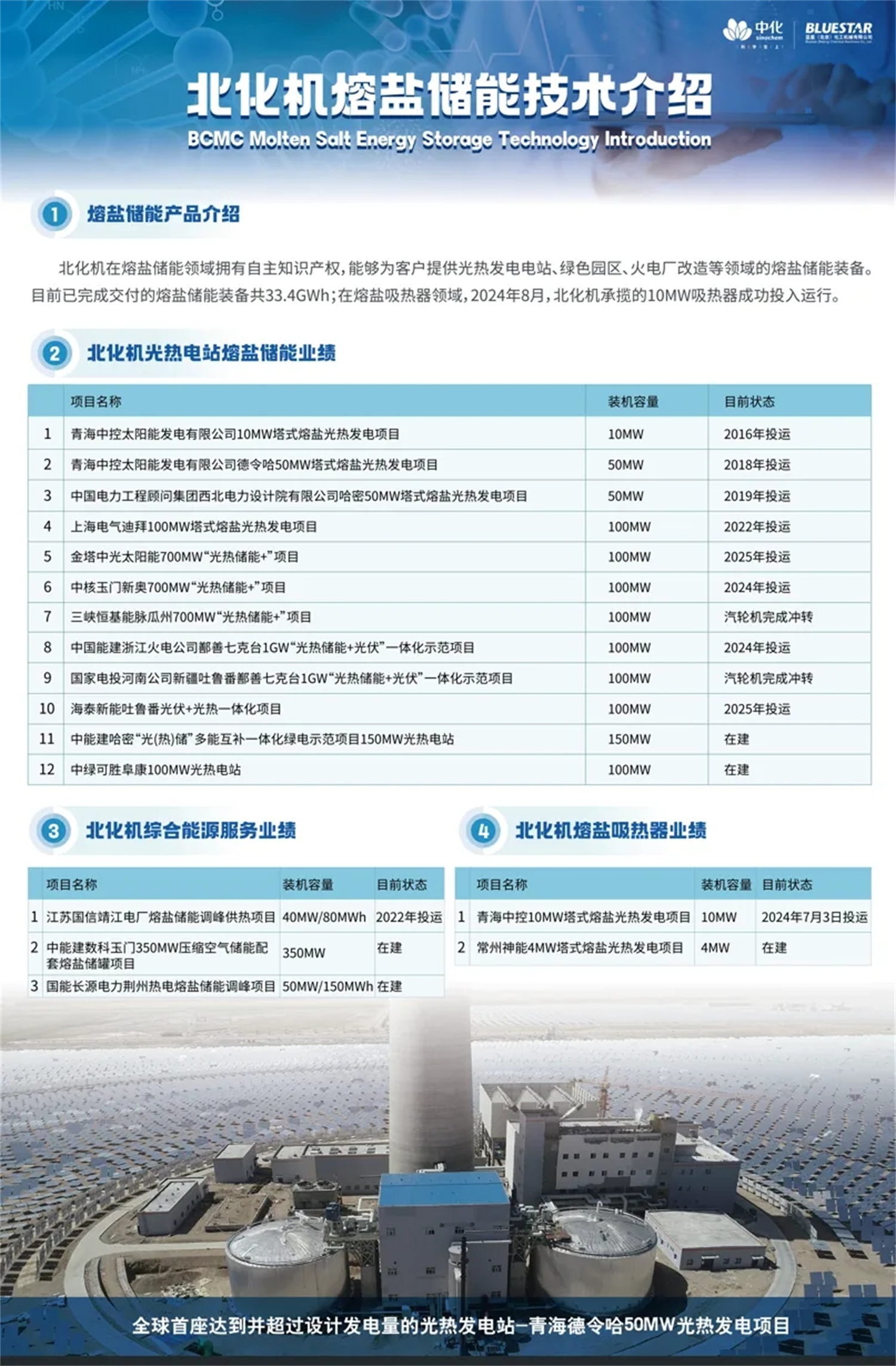 蓝星北化机依托在化工领域深耕30年积累的熔盐应用经验,在熔盐储能领域拥有自主知识产权,能够为客户提供光热发电电站、绿色园区、火电厂改造等领域的熔盐储能装备。目前已完成交付的熔盐储能装备共33.4GWh;在熔盐吸热器领域,2024年8月,北化机承揽的10MW吸热器成功投入运行。