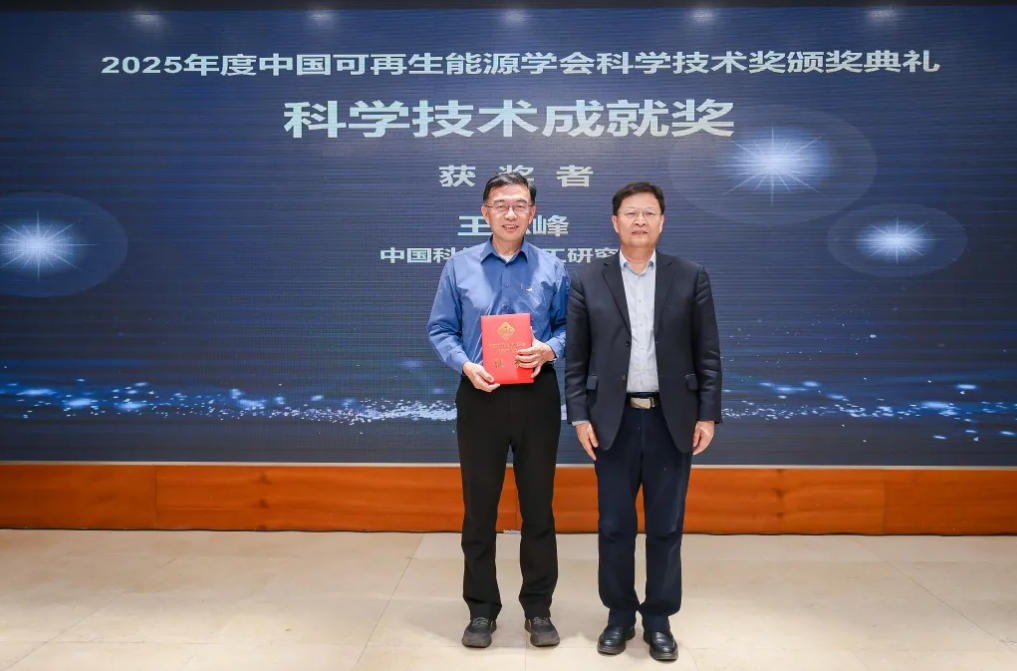 中国科学院电工研究所研究员,中国科学院大学教授王志峰博士荣获2025年度中国可再生能源学会科学技术成就奖,中国工程院院士,中国可再生能源学会理事长谭天伟教授颁奖。