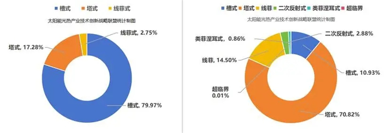 在聚光形式市场占比方面,根据太阳能光热产业技术创新战略联盟/中国可再生能源学会太阳能热发电专业委员会统计,截至2025年底,在我国光热发电累计装机容量中,塔式约占70.82%,槽式约占10.93%,线菲式约占14.50%,二次反射式约占2.88%,类菲涅耳式约占0.86%,超临界二氧化碳式约占0.01%。而国外主要国家和地区中,槽式约占79.97%,塔式约占17.28%,线菲式约占2.75%。