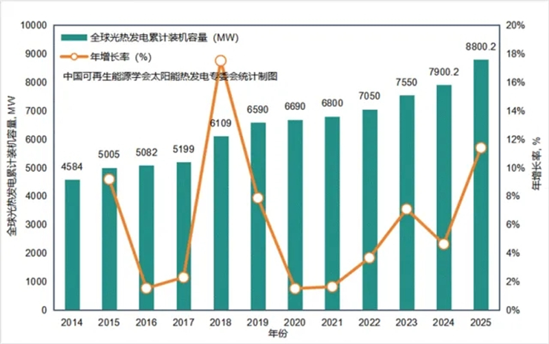 图:2025年底,全球主要国家和地区光热发电累计装机容量达到8800.2MW(含美国20世纪80年代建设、现已退役的8座槽式电站),同比增长11.4%