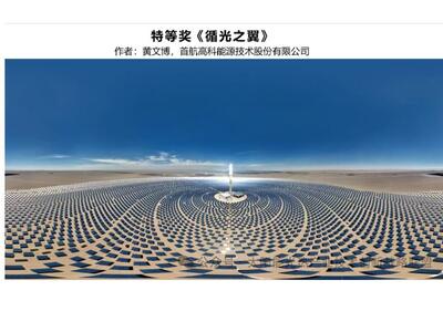 作者运用鱼眼镜头拍摄首航敦煌100MW熔盐塔式光热电站,通过独特的视角把这个地面的镜场面变成了翅膀形式,有了一种变形的、抽象的美感,整个画面从形式到色彩都很有力量。#循光之翼特等奖#首航高科能源技术#未来能源探索