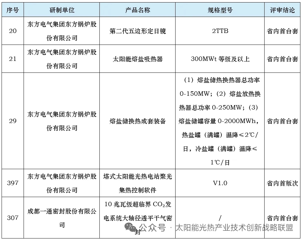 3月13日,四川省经济和信息化厅、四川省财政厅发布了《2025年度四川省重大技术装备首台套新材料首批次软件首版次产品认定公示名单》,共449个产品入选。其中,太阳能光热联盟理事单位——东方电气集团东方锅炉股份有限公司(简称:东方锅炉)凭借核心技术突破,4项光热发电领域产品成功入选,彰显了企业在新能源高端装备制造领域的硬核实力与自主创新能力。