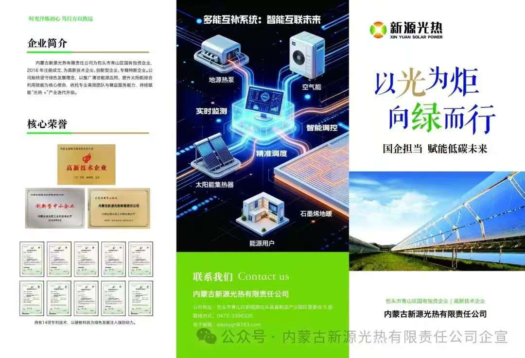 内蒙古新源光热有限责任公司为包头市青山区国有独资企业,2016年注册成立,为高新技术企业、创新型企业、专精特新企业。公司始终坚守绿色发展理念,以推广清洁能源应用、提升太阳能综合利用效能为核心使命,依托专业高效团队与精益服务能力,持续赋能“光热+”产业迭代升级。