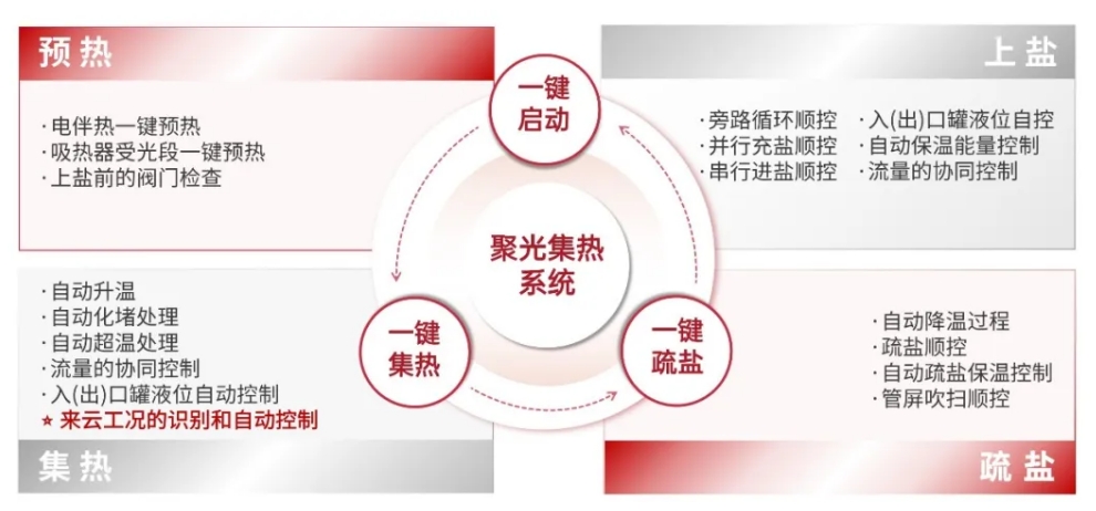 聚光集热系统智能化解决方案集成一键启动、一键集热与一键疏盐三大核心功能,可实现镜场在预热、进盐、运行、疏盐全流程中镜场能量、熔盐流量与温度的智能化精准控制,既显著降低系统的操作难度,又大幅提升系统的可靠性与光资源利用率。