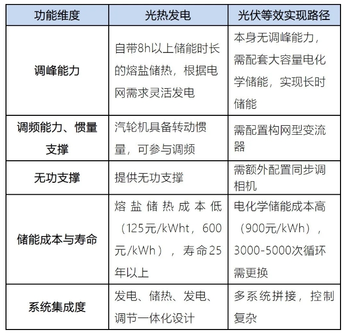 若将光热发电的功能完整还原为光伏系统实现同等能力的配置,其等效系统应为:光热发电≈光伏+大容量长时构网型电化学储能+同步调相机。同样系统功能下,光热和光伏实现路径对比如下表所示: