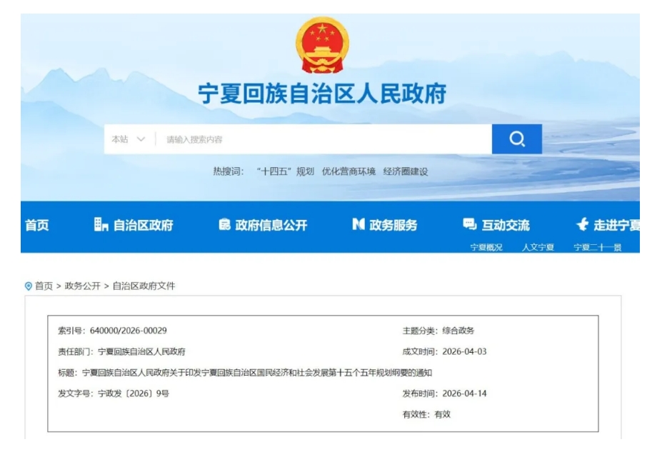 4月14日,宁夏回族自治区人民政府印发《宁夏回族自治区国民经济和社会发展第十五个五年规划纲要》。
