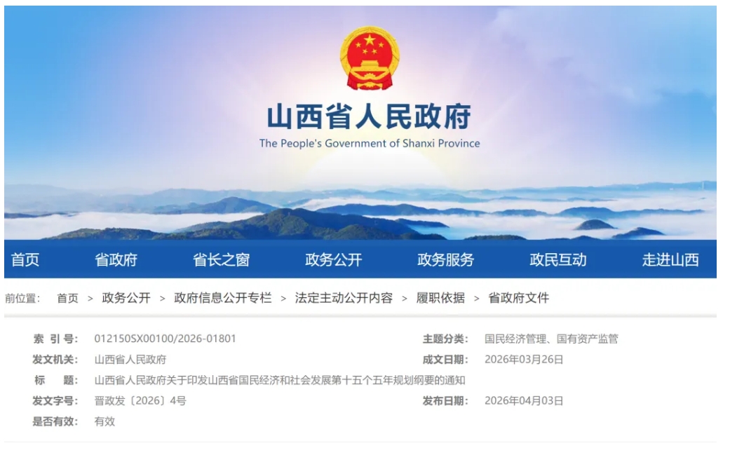 近日,山西省人民政府发布关于印发《山西省国民经济和社会发展第十五个五年规划纲要的通知》。