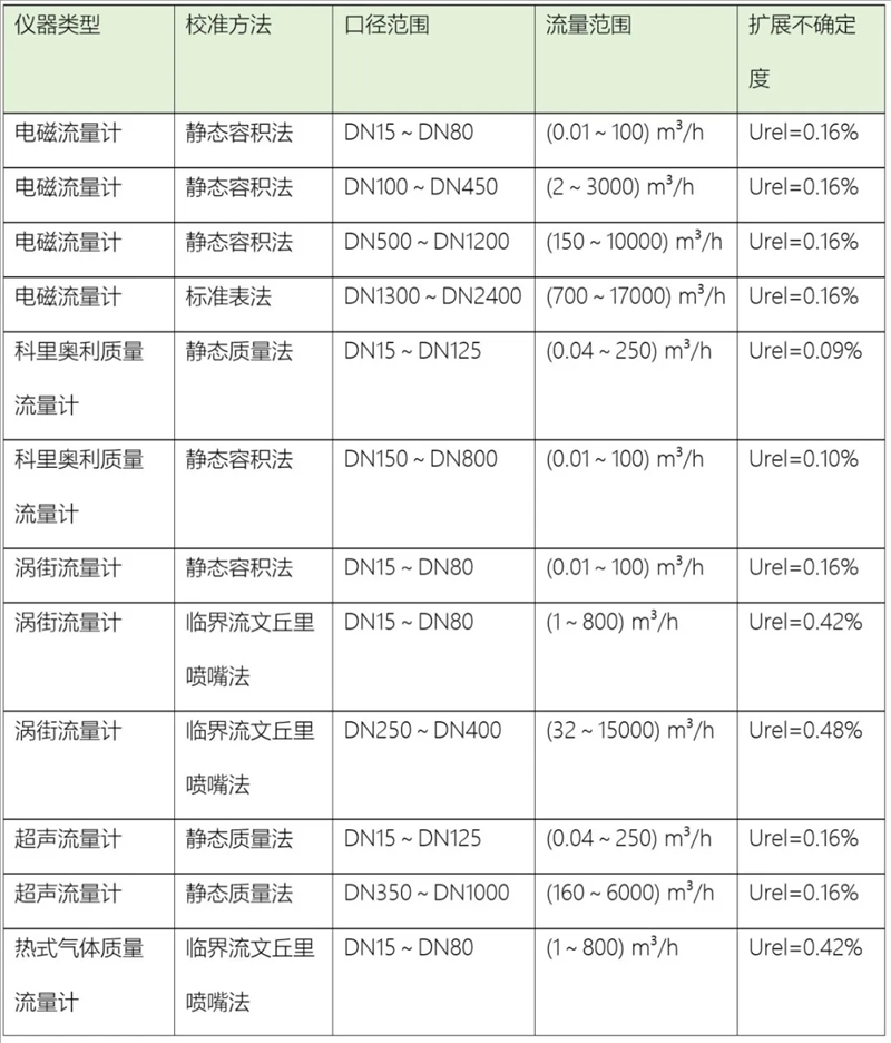 川仪流量仪表校准实验室已通过中国合格评定国家认可委员会(CNAS)认可,注册号:CNAS L6467,符合ISO/IEC 17025:2017要求。实验室具备覆盖电磁、涡街、超声、科里奥利质量、热式气体、差压、涡轮、浮子等全系列流量仪表的校准能力,测量范围和扩展不确定度(k=2)如下:
