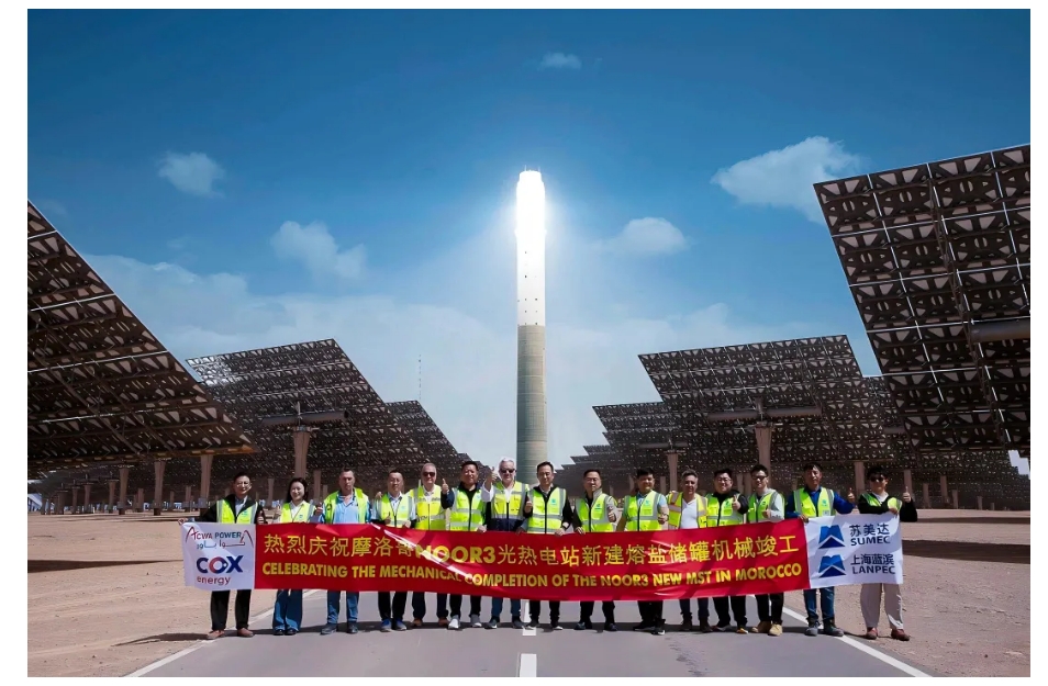近日,蓝科高新联合苏美达能源共同承建的摩洛哥Noor3塔式光热电站熔盐储罐拓建项目机械竣工,提前一个月完成既定目标。苏美达股份总经理、党委副书记,蓝科高新党委书记、董事长王健,苏美达能源公司党总支书记、董事长郭宏伟、苏美达能源公司副总经理陈宇、蓝科高新总工程师张玉福以及项目团队全体成员共同出席竣工仪式。