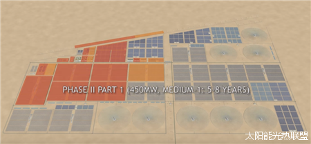 该园区计划分三期建设,其中一期规划70MW,投资额达3.85亿美元,包括1个50MW槽式热发电项目、10MW光伏和10MW风电项目。二期规划分为两部分,总容量930MW,包括8个槽式和2个塔式热发电项目。三期规划分为两部分,总容量1000MW,包括6个槽式和6个塔式热发电项目。