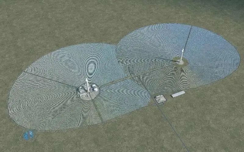 其中,光热发电采用塔式熔盐技术路线,装机规模为2×50MW,采用“双塔一机”模式,两座200米高吸热塔相距1公里,配置一台额定功率为100MW的汽轮发电机组,高、低温熔盐储罐各1台,镜场采光面积约80万平米,选用29.7平方米的矩形定日镜近27000面。